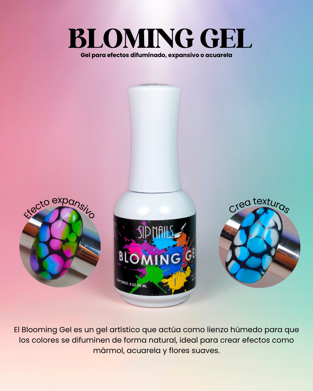 🔹 Efecto automático: al aplicar tu gel de color sobre el Blooming, este se expande creando diseños artísticos como flores, mármol, acuarela o degradados.
