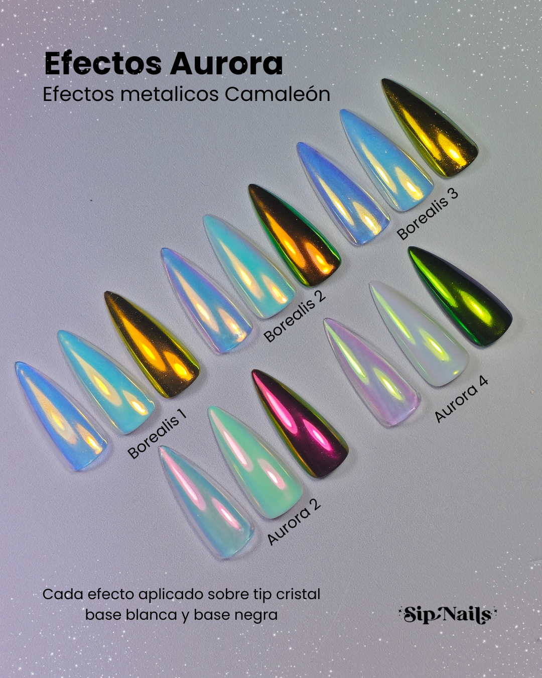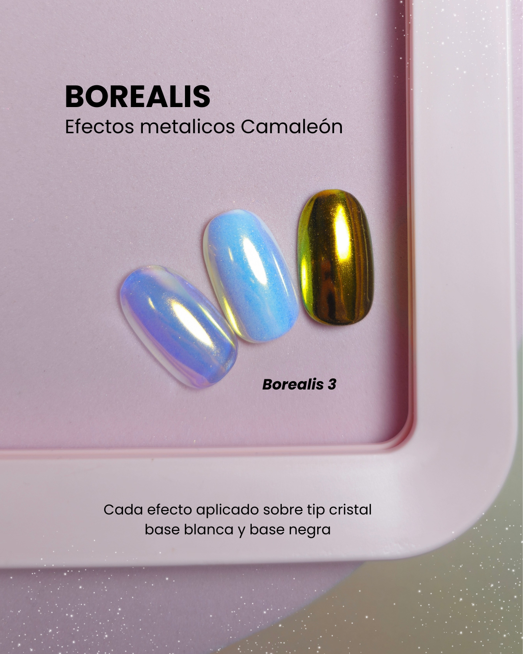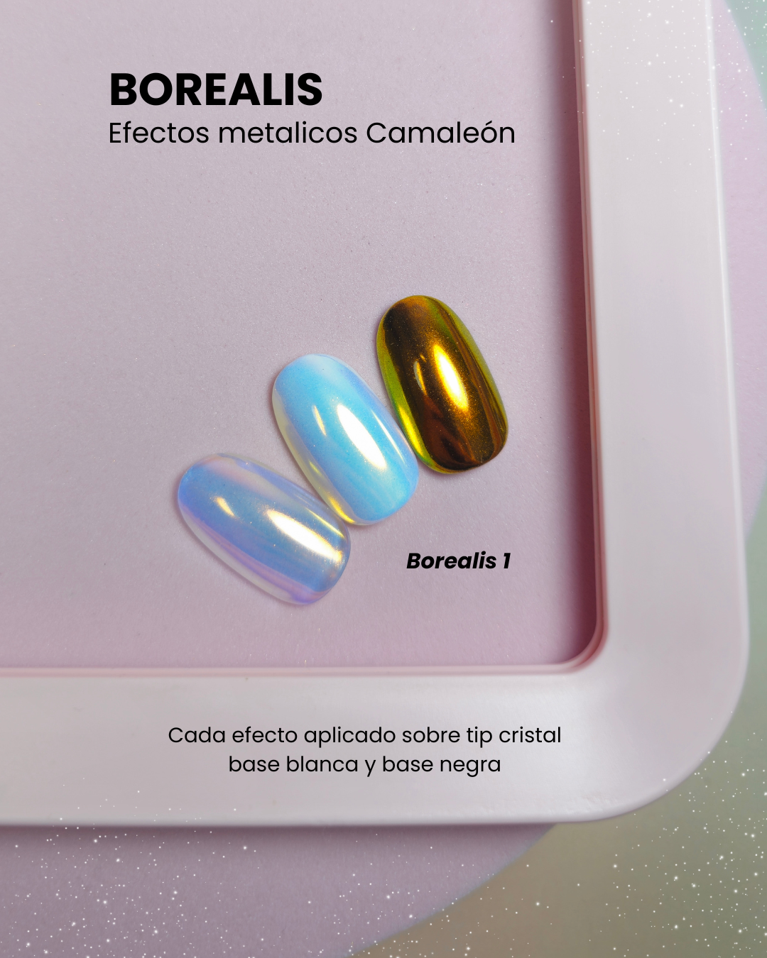Disponibles en tonos únicos como Borealis y Aurora, estos pigmentos premium transforman cualquier manicura en un espectáculo brillante y sofisticado.