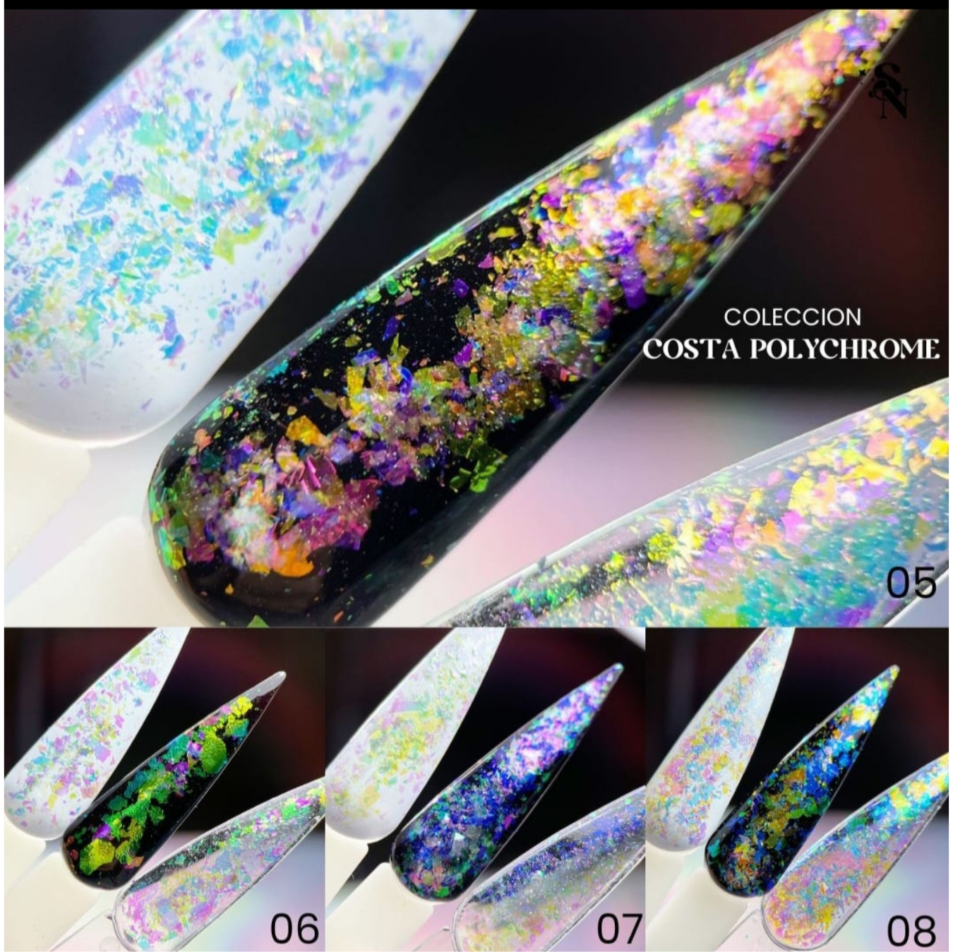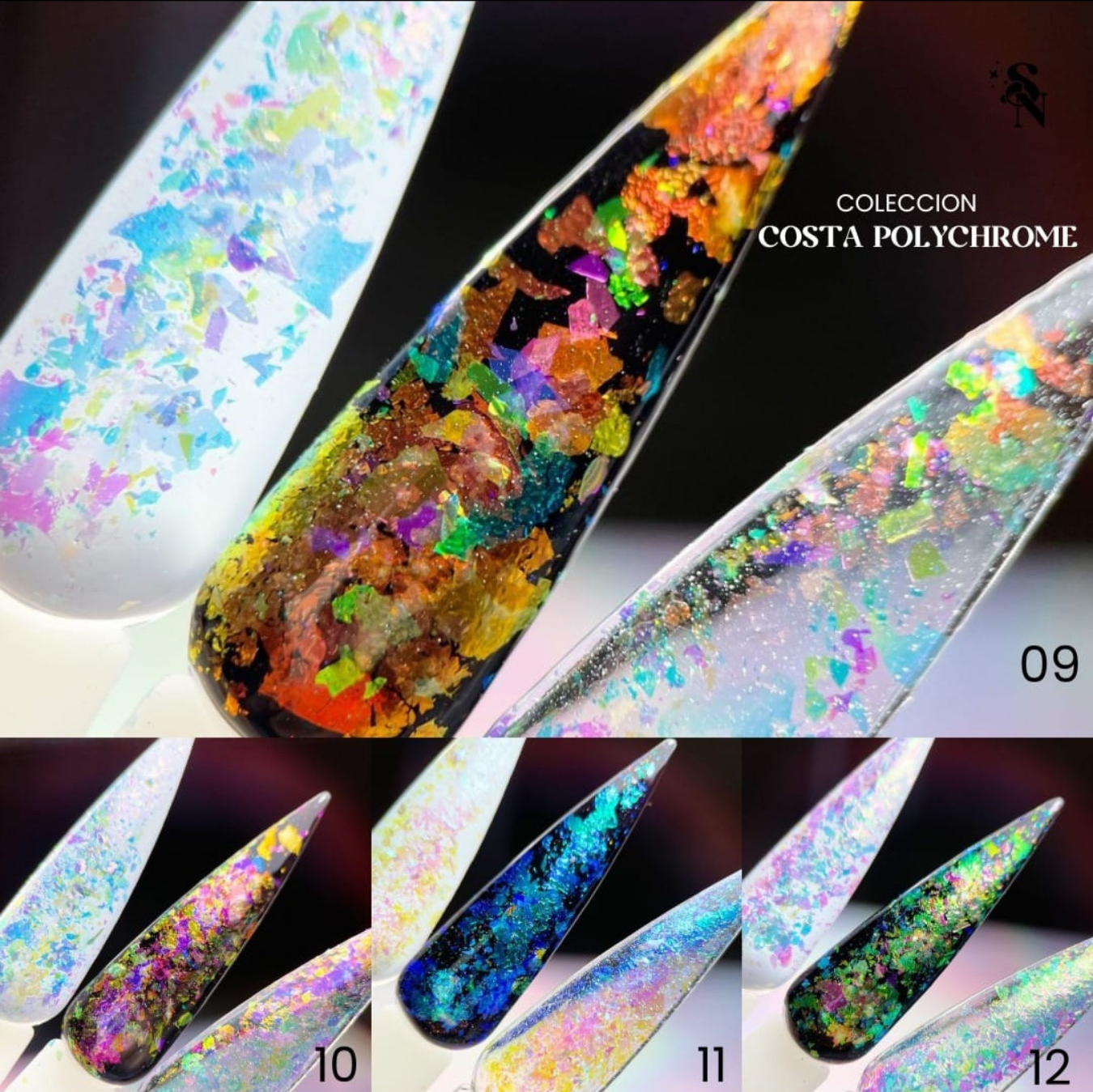 Costa Polychrome es una colección de 12 flakes iridiscentes que transforman cualquier diseño en un espectáculo multicolor. Sus hojuelas ultrafinas cambian de tono según la luz y el fondo en el que se apliquen, logrando acabados intensos, luminosos y con un efecto camaleón deslumbrante.
