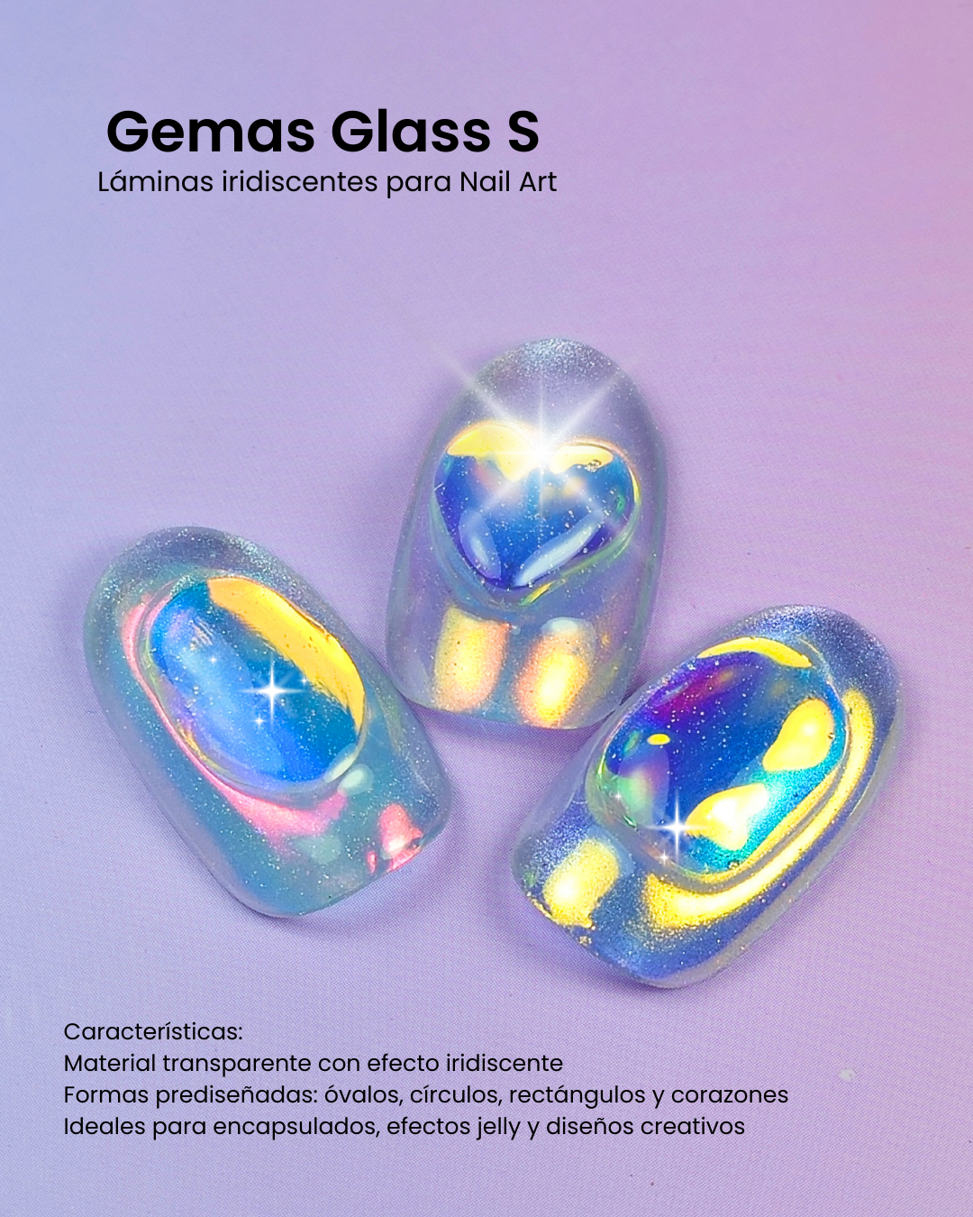 Láminas iridiscentes que transforman la luz en color. Su material transparente con efecto holográfico aporta profundidad, brillo y dimensión a cada diseño. Con formas prediseñadas, son ideales para encapsulados, efectos jelly y Nail Art creativo que destaca desde cualquier ángulo.