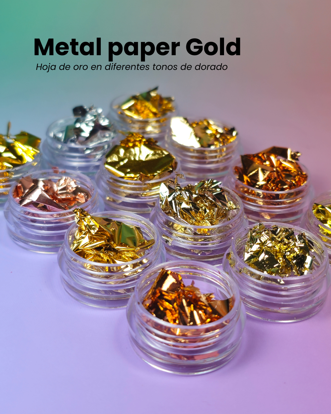 Hoja de oro en diferentes tonos dorados para elevar tus diseños al siguiente nivel.Texturas metálicas ultrafinas que se adaptan a cualquier estilo: desde detalles sutiles y elegantes hasta composiciones más intensas y protagónicas. Perfecta para encapsular, crear acentos de lujo o dar ese efecto gold touch que transforma por completo el nail art.Un básico infalible para diseños sofisticados, modernos y llenos de brillo