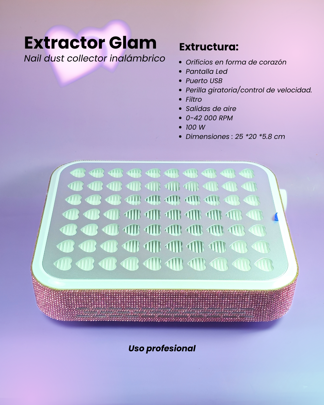 El Extractor Glam combina potencia profesional y diseño brillante, ideal para largas jornadas de trabajo.