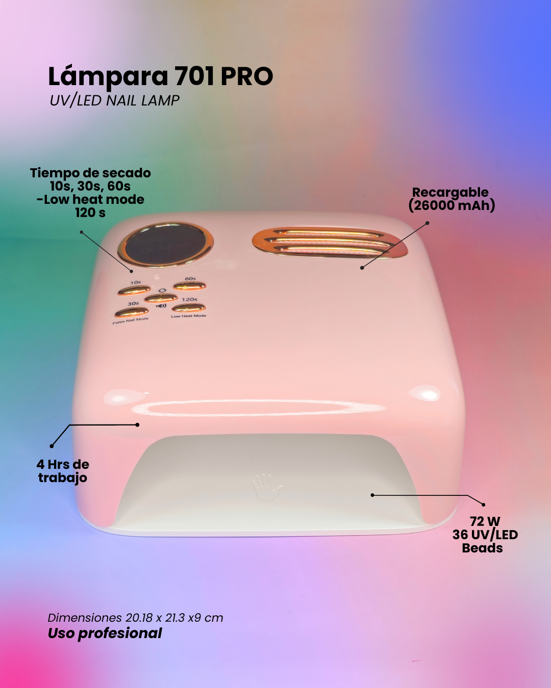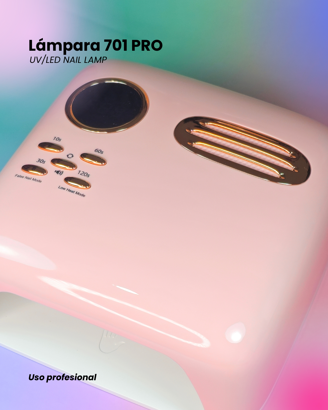 La Lámpara 701 PRO ofrece 72 W de potencia con 36 focos UV/LED, asegurando un curado rápido, uniforme y eficiente en todo tipo de gels.