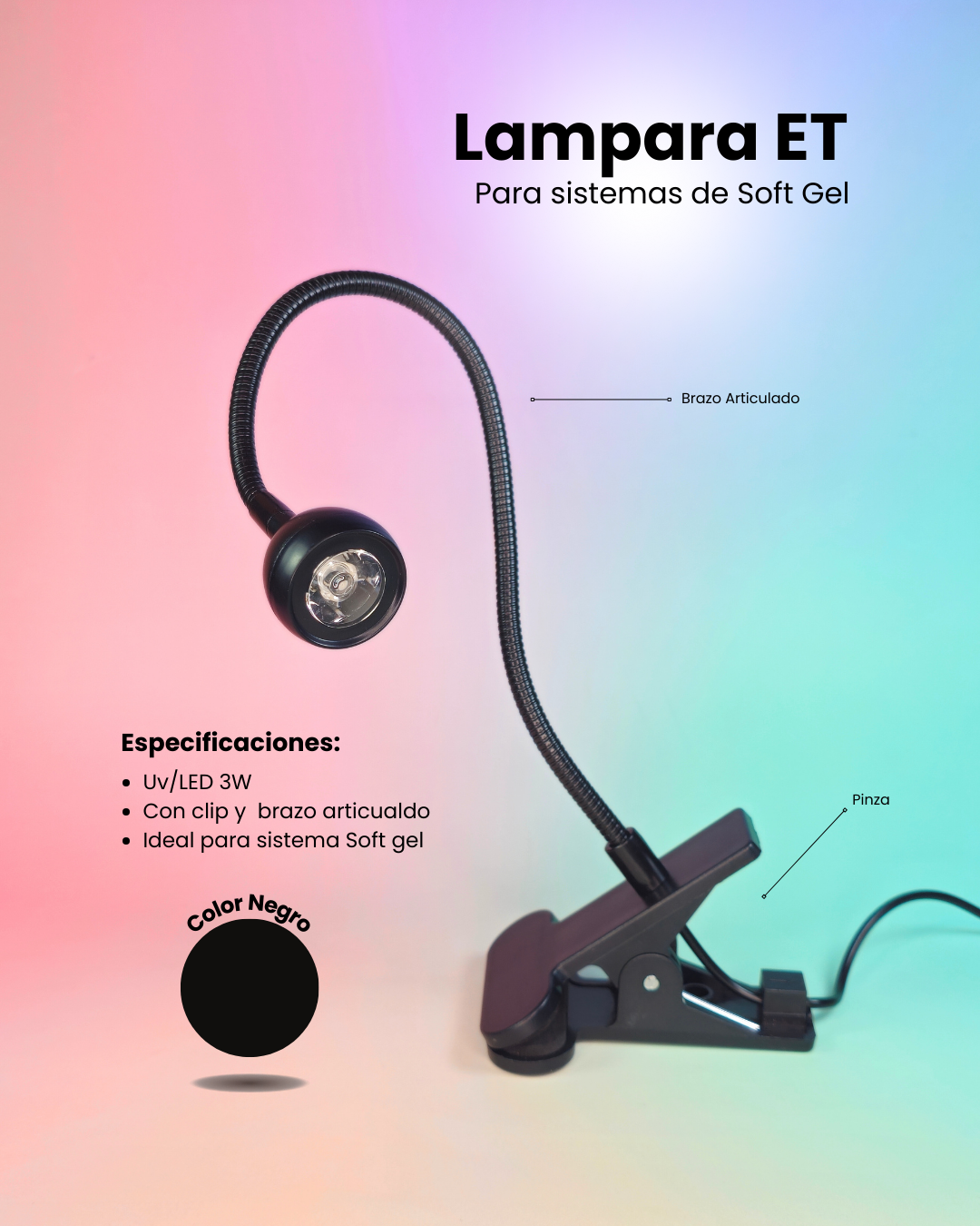 Su brazo articulado con clip permite máxima comodidad y libertad de movimiento, mientras que su luz UV/LED de 3W asegura un curado eficiente en cada aplicación.