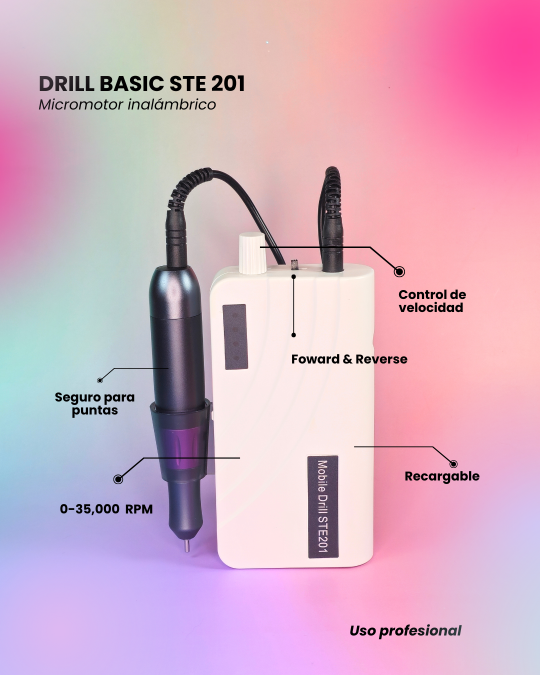 El Drill Basic STE 201 ofrece un rendimiento estable de 0 a 35,000 RPM, ideal para limado, preparación y técnicas de estructura.