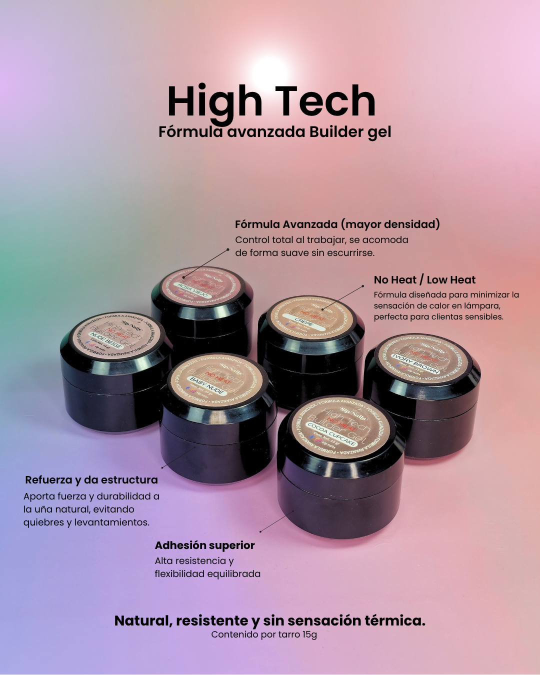 Su tecnología NO HEAT (Low Heat) reduce la sensación térmica en lámpara, ofreciendo una aplicación cómoda incluso en uñas sensibles. Gracias a su densidad media y textura autonivelante, permite construir, nivelar y fortalecer la uña natural con total control, logrando un acabado suave, uniforme y ultra natural en tonos nude que embellecen cualquier tono de piel.