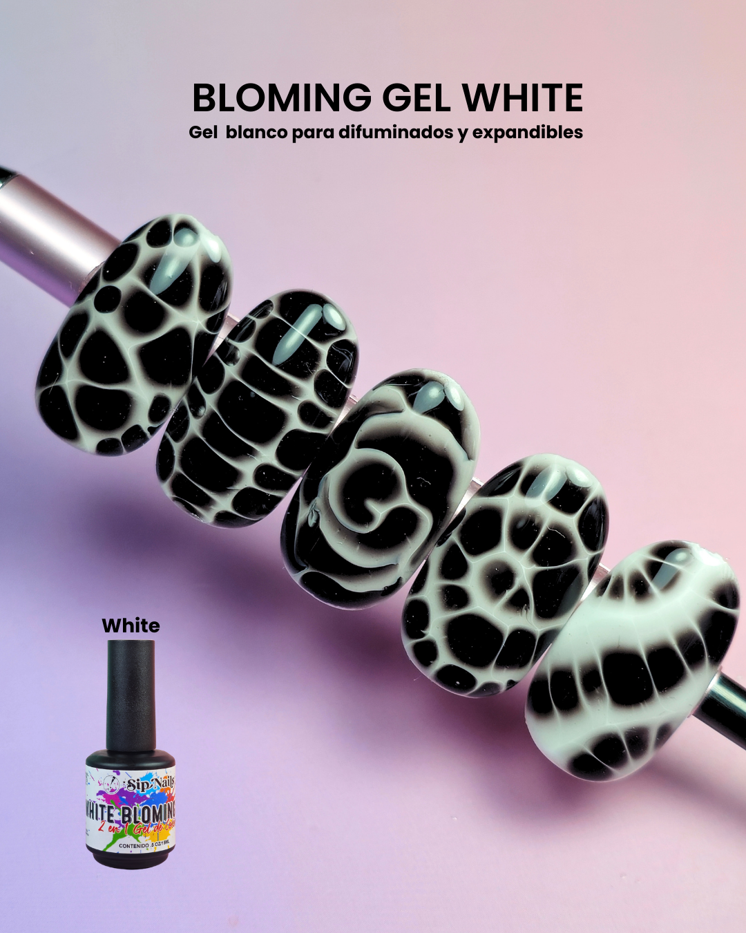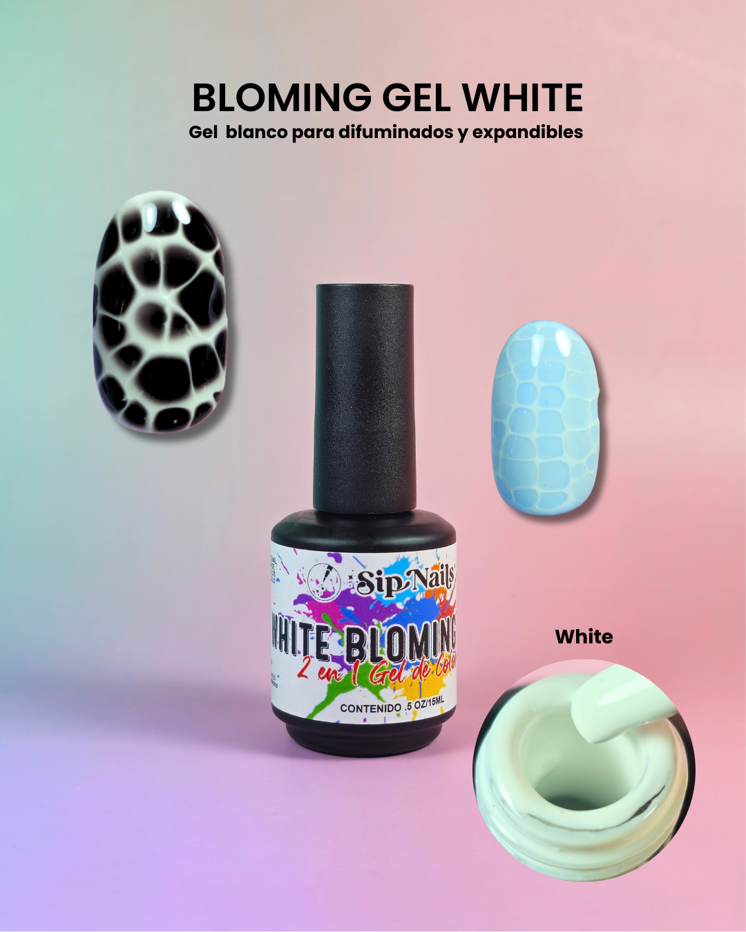 Gel blanco de efecto blooming diseñado para crear difuminados, patrones orgánicos y diseños expandibles. Su fórmula reactiva permite que el color se disperse de forma controlada, logrando efectos abstractos, tipo mármol, reptil o acuarela con facilidad. Textura equilibrada para un manejo preciso y resultados profesionales.