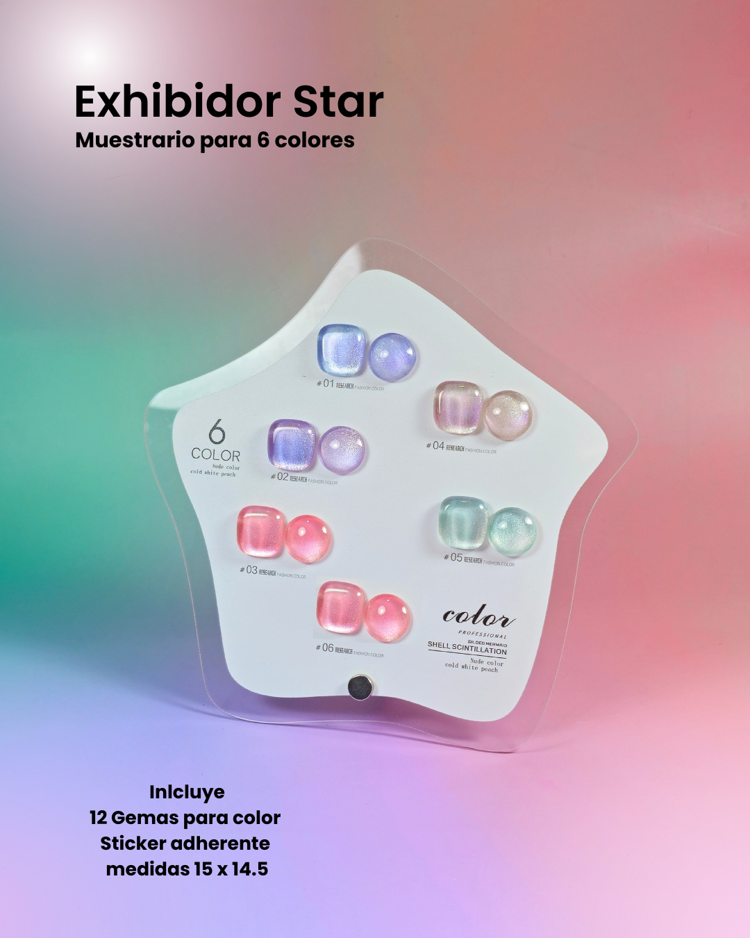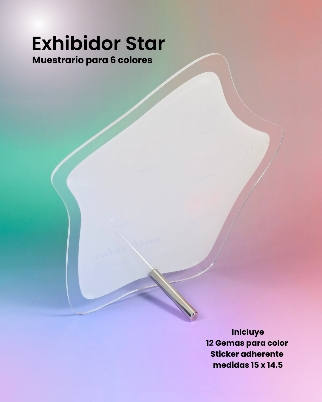 Muestrario en forma de estrella ideal para presentar hasta 6 colores de forma clara y atractiva. Incluye gemas adhesivas para aplicar color fácilmente y visualizar acabados reales. Perfecto para organizar, comparar tonos y elevar la experiencia visual en tu mesa de trabajo.