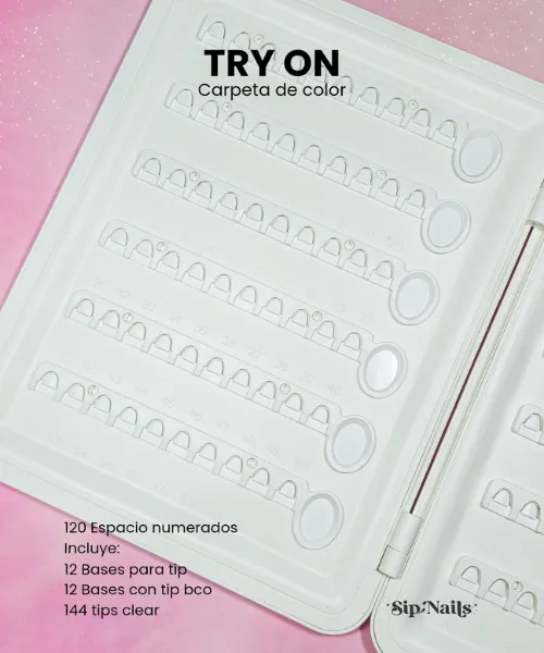 Carpeta de plástico rígido y resistente, diseñada para exhibir tus colores, efectos y diseños de forma dinámica. Cuenta con 120 espacios numerados para que tus clientes prueben cada tono. Además, puedes remover y cambiar las bases cuantas veces quieras para mantener tu muestrario siempre actualizado.
