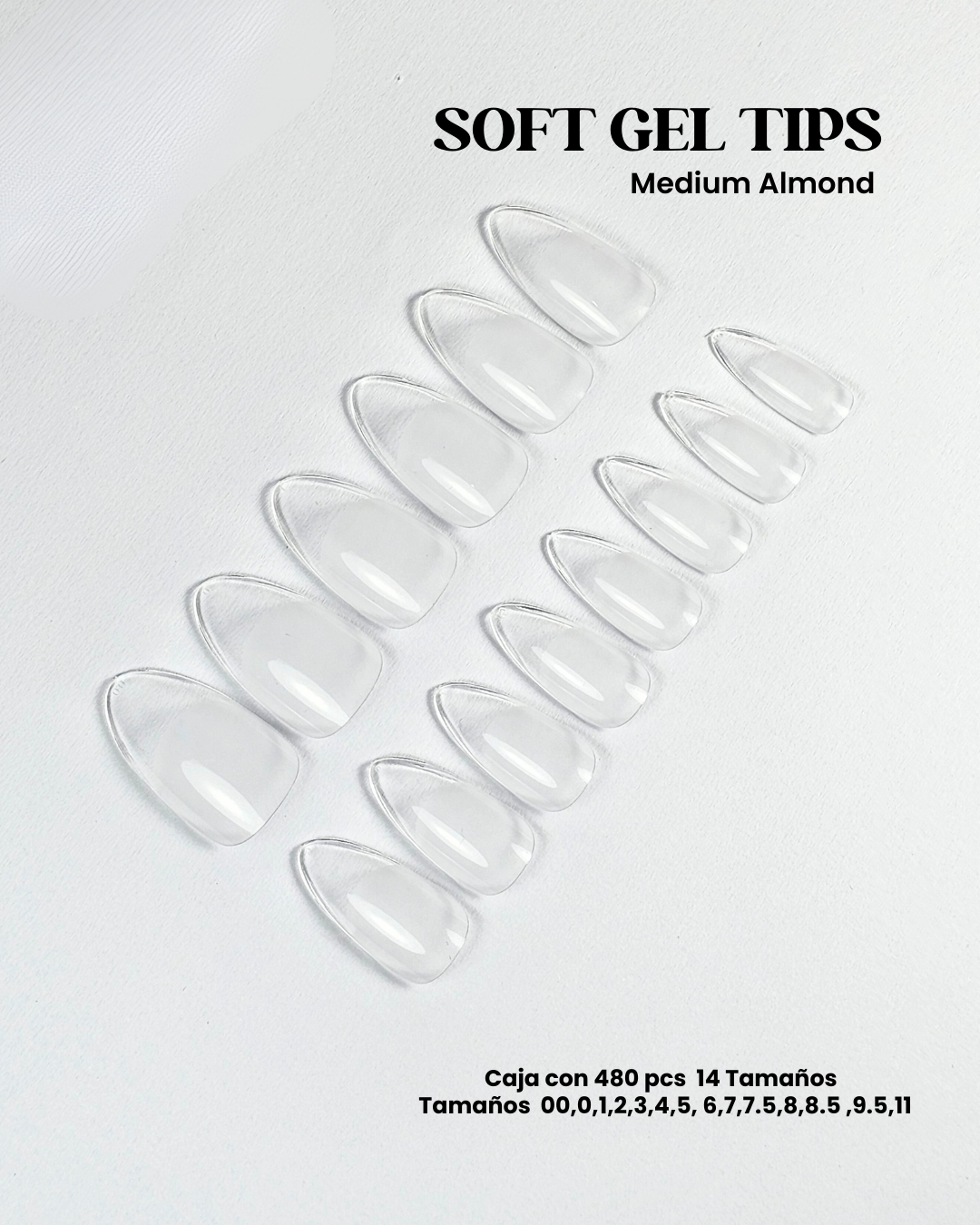 Tips preformados de soft gel con curvatura equilibrada y área de cutícula delgada para un sellado preciso. Flexibles, resistentes y de cobertura full, diseñados para una aplicación rápida y un acabado profesional. La forma Medium Almond es la más solicitada por su versatilidad y estética estilizada.